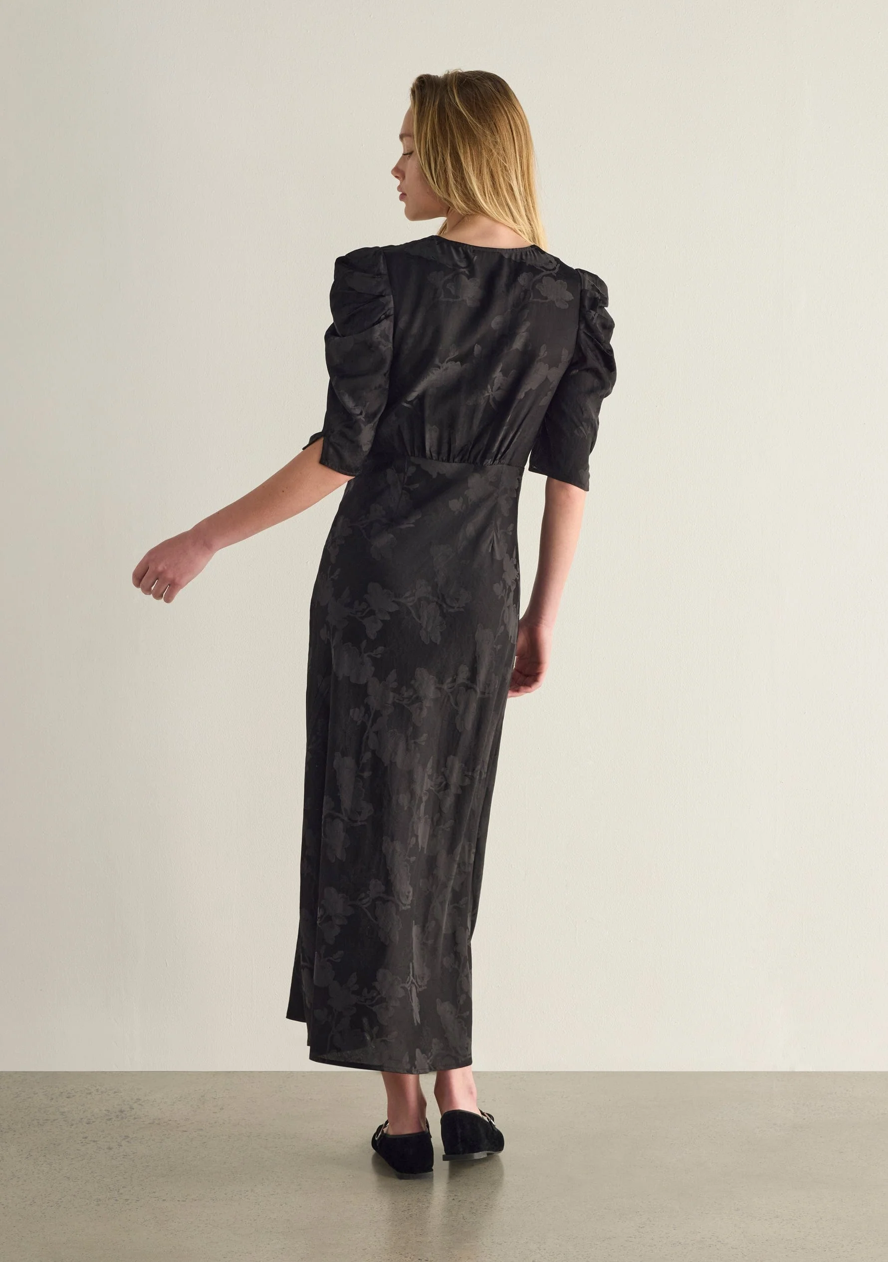 The Adley Midi Dress is a classic silhouette designed to carry you effortlessly from the quiet to the unexpected. Now crafted in a luxurious black textured floral jacquard spun silk, this elevated style delivers a softly structured drape with a subtle sheen and elegant texture. Featuring a dramatic gigot sleeves with delicate cuff splits, the Adley is bias-cut to gently skim and flatter the figure in all the right places.