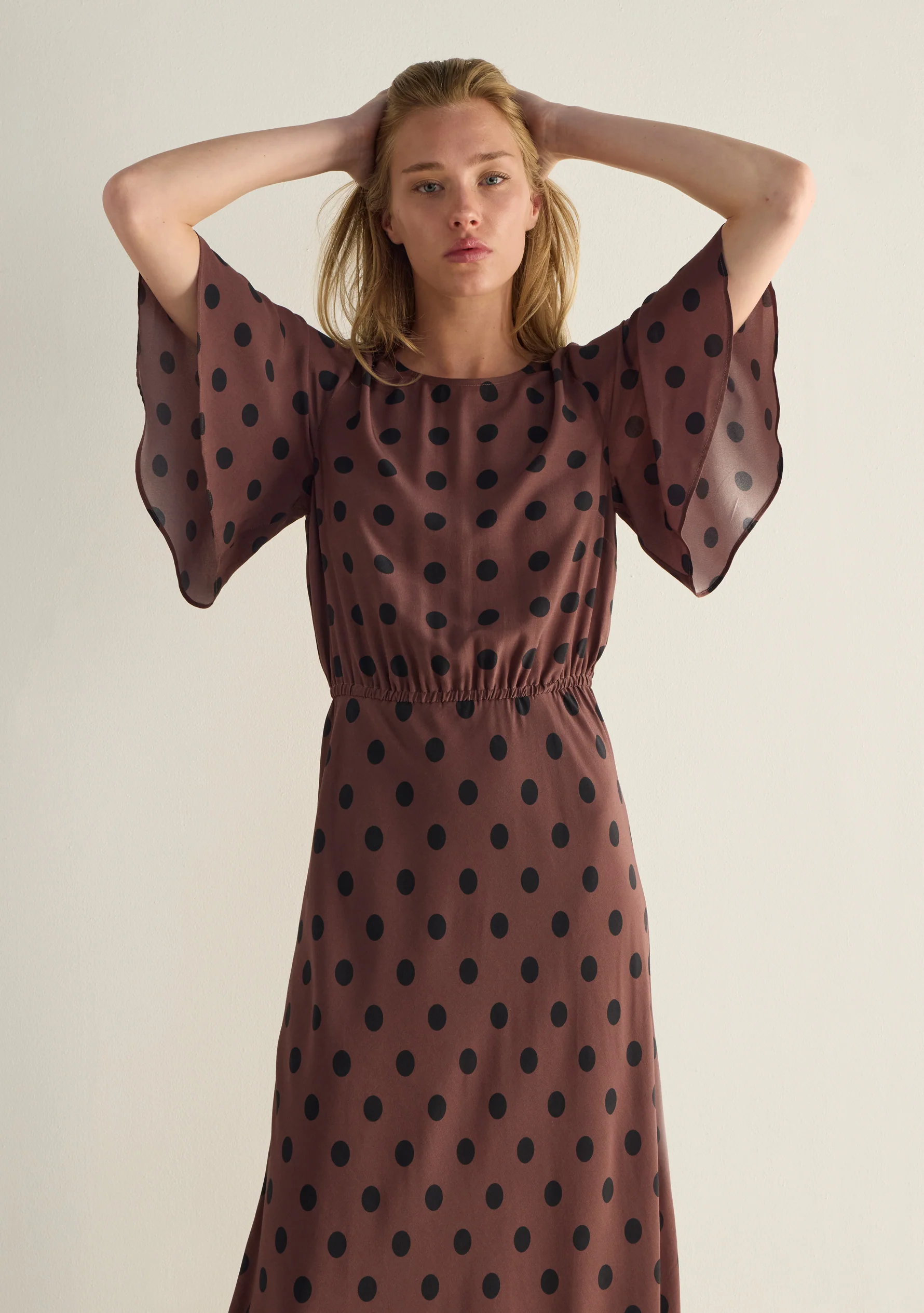The Alexandria Maxi Dress in our bold chocolate polka print is a flattering feminine silhouette designed to make a statement. Featuring elbow-length flutter sleeves, a blouson bodice, and an elasticated waist for comfort, it falls into a bias-cut skirt that skims the body and drapes beautifully to the hem.