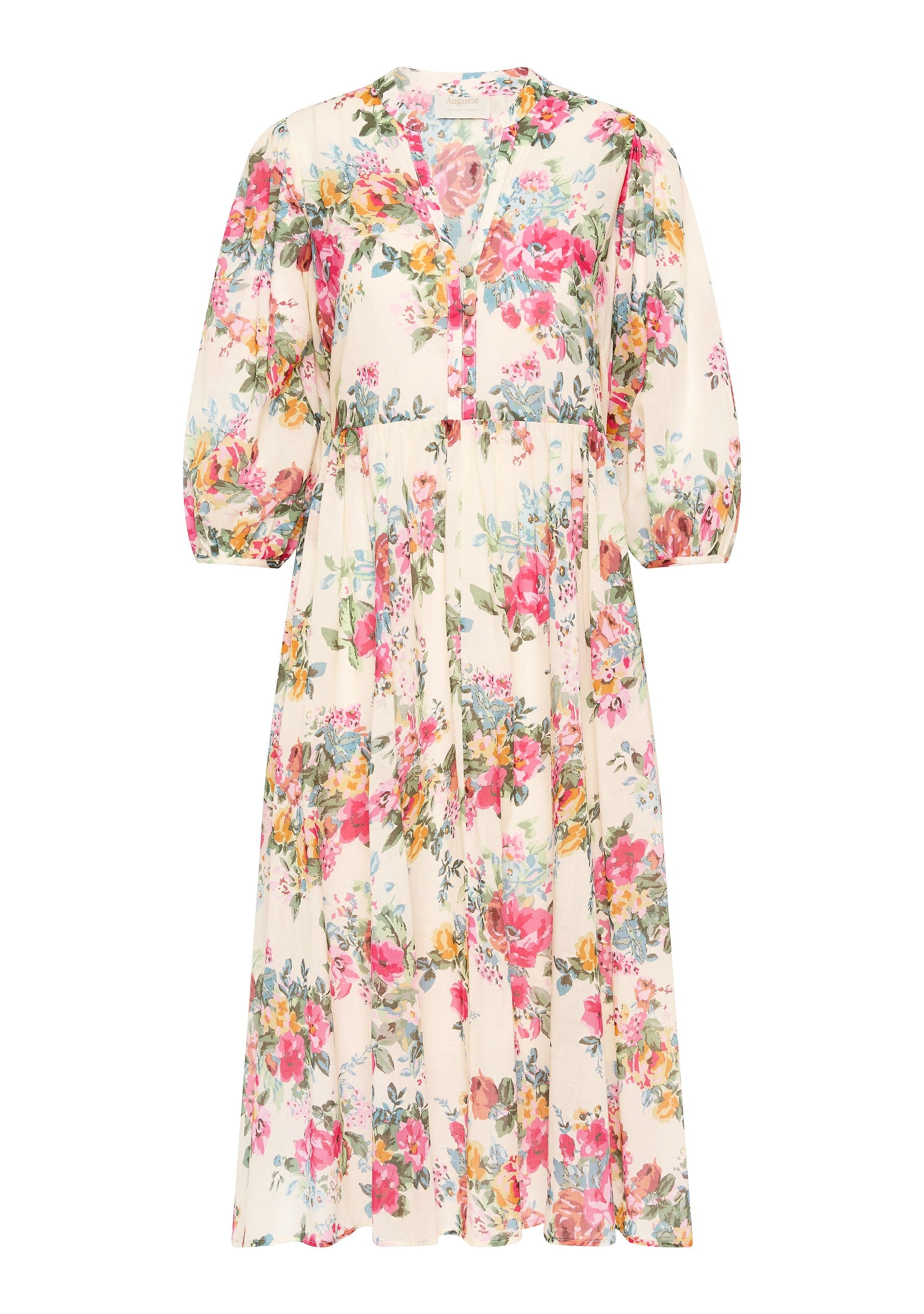The Amaya Midi Dress in our vintage-inspired Iris floral is a modern take on a classic mumu. Perfectly feminine with a hint of bohemian charm, it features a flattering V-neckline with a Mandarin collar, 3/4 puff sleeves, gold feature buttons, and a voluminous skirt panel dropping from a relaxed waist.