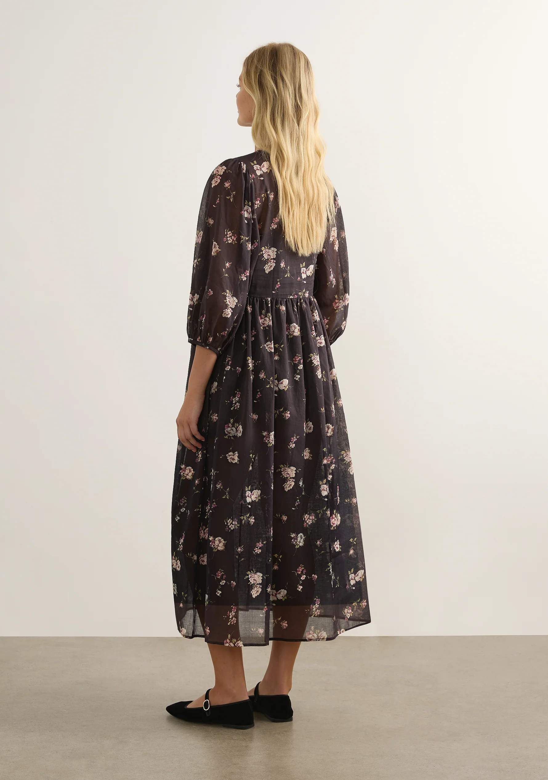 The Ellis Midi Dress in our charcoal Isla print is a best-selling silhouette reimagined in a moody, romantic floral. Crafted from lightweight organic cotton voile, this style features a flattering V neckline, button-front bodice, and voluminous sleeves. Soft gathers at the waist create a floaty, feminine silhouette, making it an effortless staple for everyday wear.