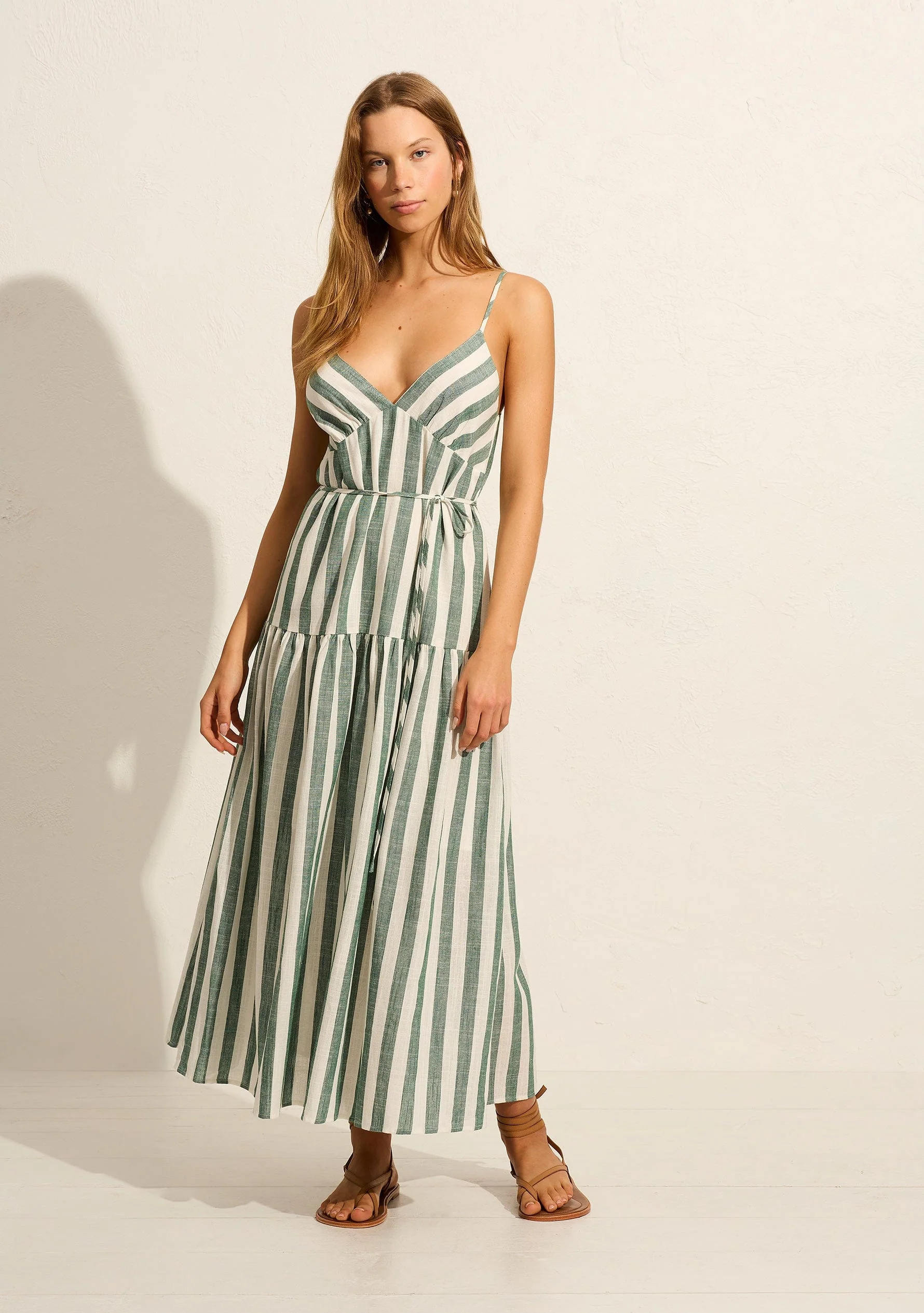 The Elowen Maxi Dress in our thick apple green and white stripe is a standout piece, crafted from linen. It features a V neckline, softly gathered bust, and a flattering drop waist that flows into a voluminous skirt, complete with an optional tie for a more fitted look.