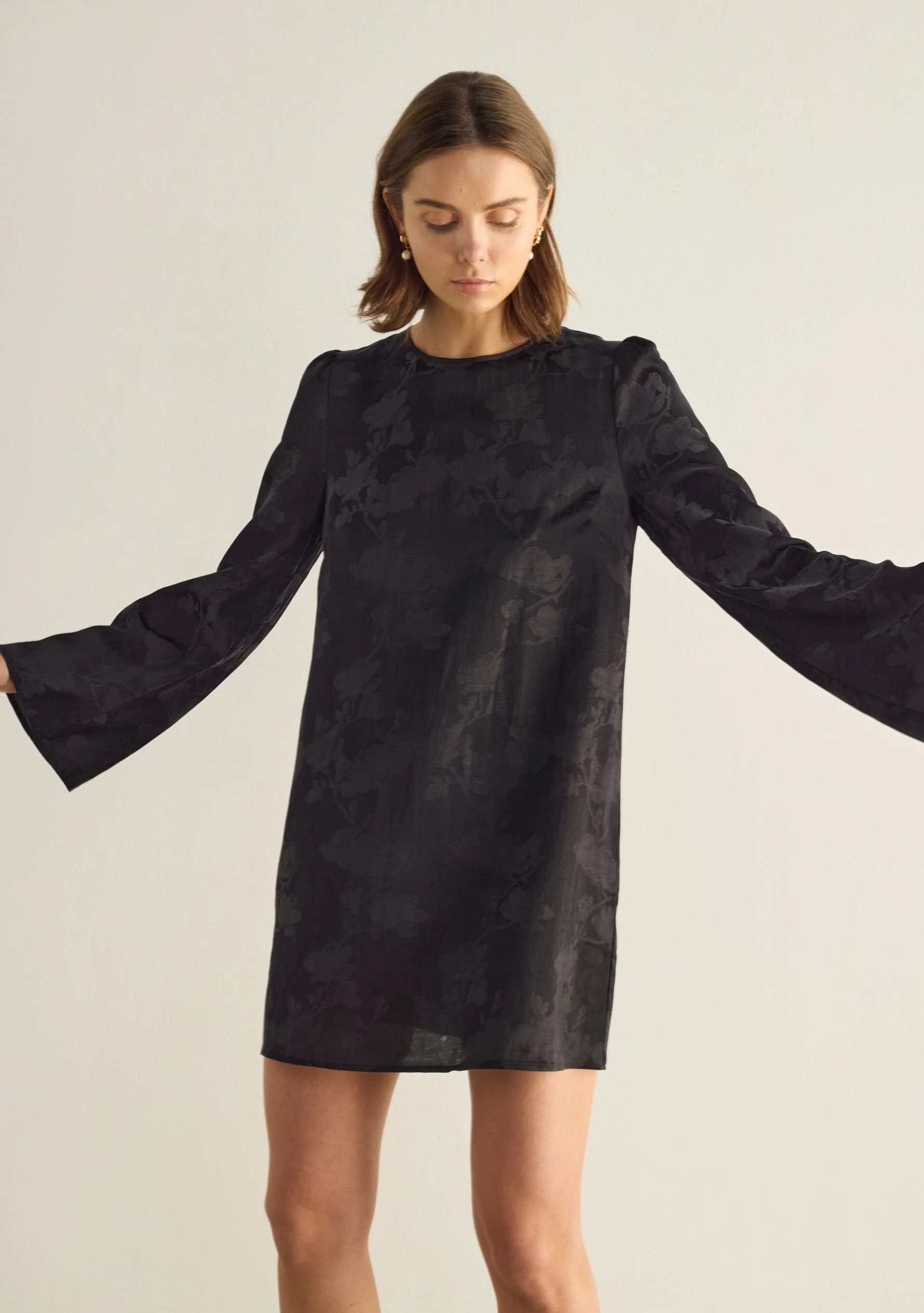 Slip into the Georgina Mini, in a luxurious black textured floral jacquard spun silk. With a subtle sheen and rich surface texture, this elevated fabric brings depth to a timeless silhouette. Designed in a relaxed shift shape, it offers a fluid, easy fit that gently skims the body.Â