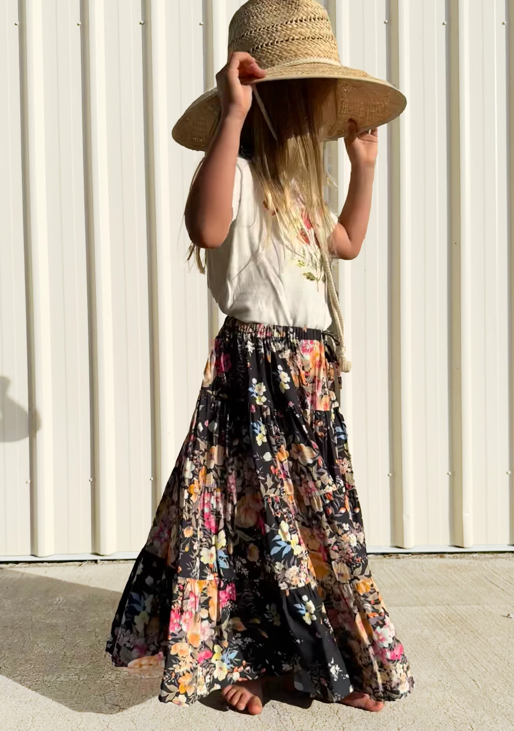 The Little Miss Maxi Skirt in the black-based Camelia print is a cherished Little Auguste favourite. Designed with an easy elasticated waist and a famously twirl-worthy, voluminous skirt, it’s a piece she’ll never want to take off. Part of our mummy-and-me matching collection, available exclusively online and in-store at Auguste.