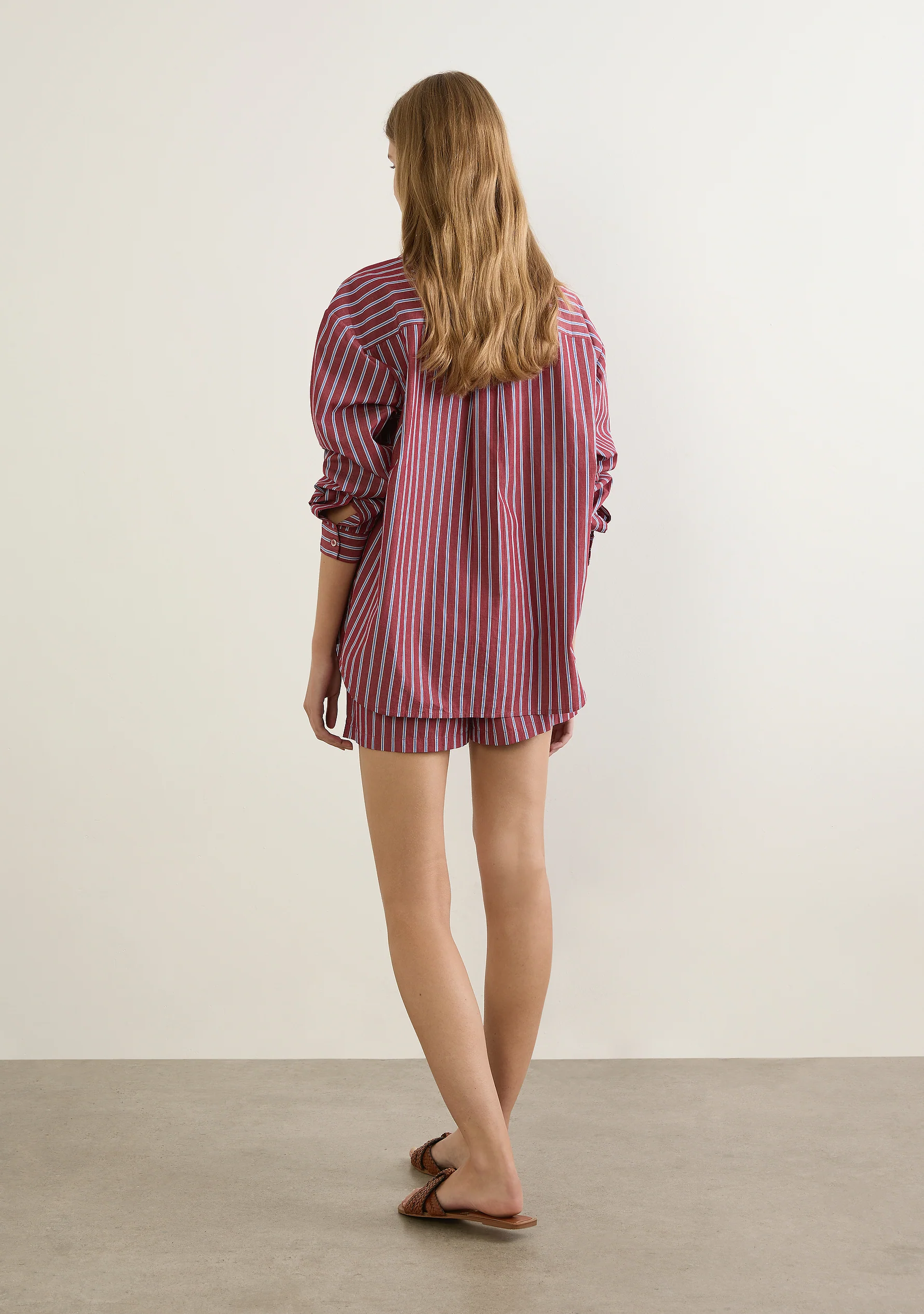 The Lucien Shirt in washed-back red with blue and white woven pinstripes is a classic wardrobe staple with a relaxed, modern edge. Featuring a traditional shirt collar, button-front closure, and pocket with back yoke detailing, it’s designed in an intentionally oversized fit. Crafted from 100% cotton in a soft yet crisp woven stripe, this versatile style pairs perfectly with the matching Joe Shorts for an effortless summer set.