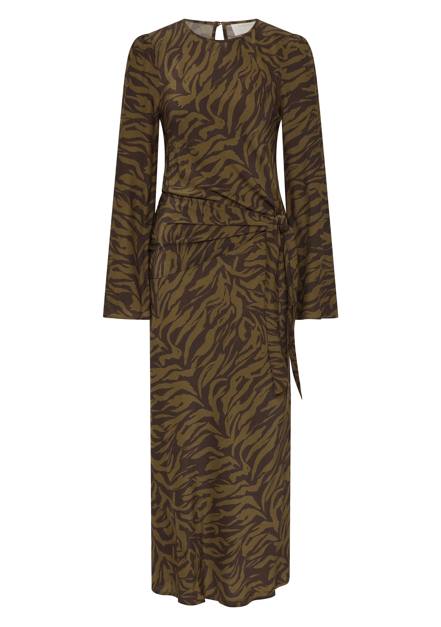 Meet Milani—the midi that glides from desk to dinner. Rendered in our olive Zya contemporary zebra print, it skims the figure with a flattering bias-cut silhouette before flaring through softly ruffled long sleeves. A clean round neckline, back keyhole, and adjustable side-seam waist ties let you finesse the fit.