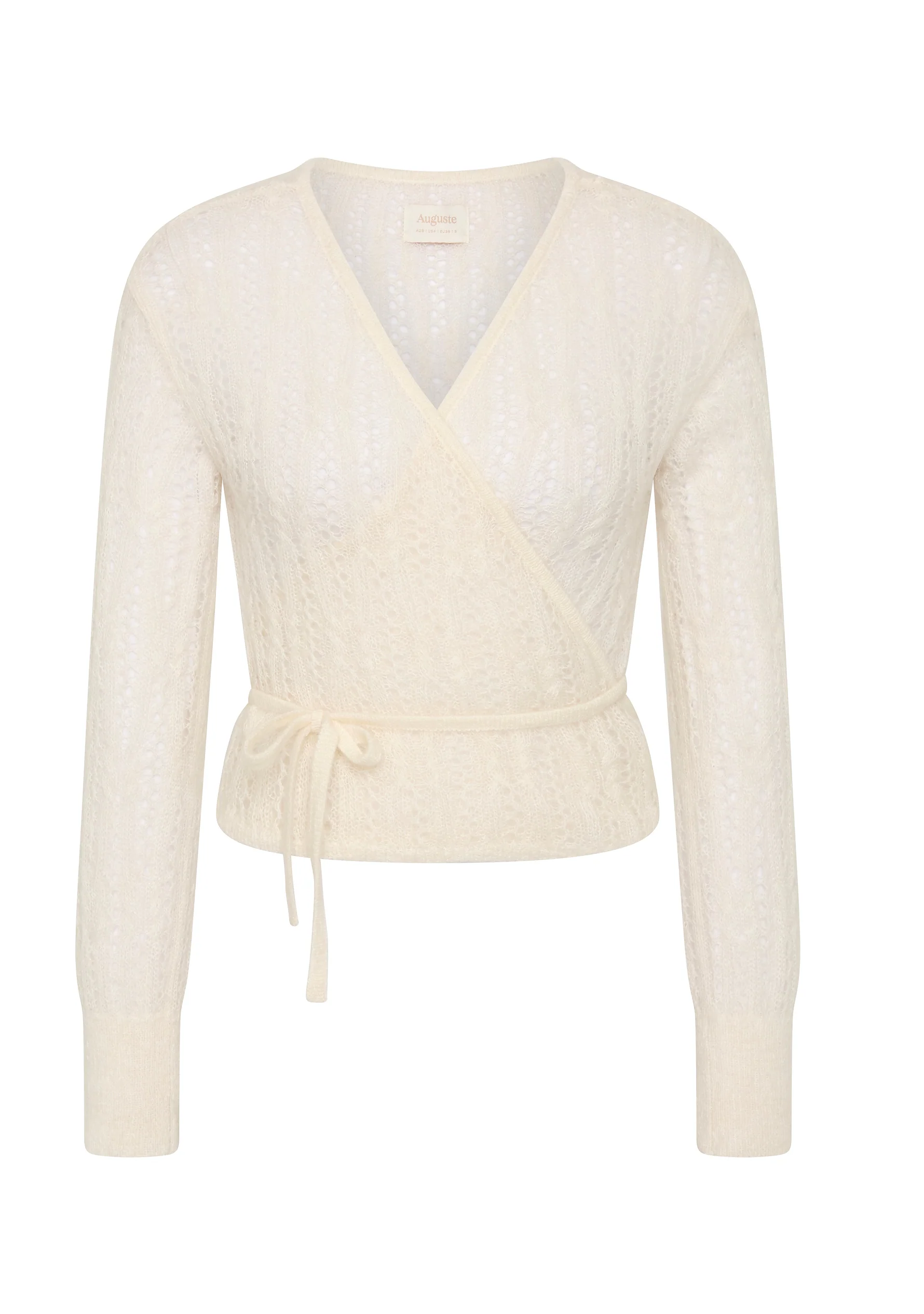The Rowan Wrap Knit Cardigan in pearl is crafted in a feminine, sheer open-weave knit from a cosy mohair and wool blend with a soft, warm hand feel. Inspired by a classic ballerina wrap, it features a functional wrap silhouette with ribbed detailing at the neckline, cuffs and hem for a refined finish. Cut in a timeless fit, Rowan layers effortlessly while bringing a touch of feminine elegance to everyday styling.