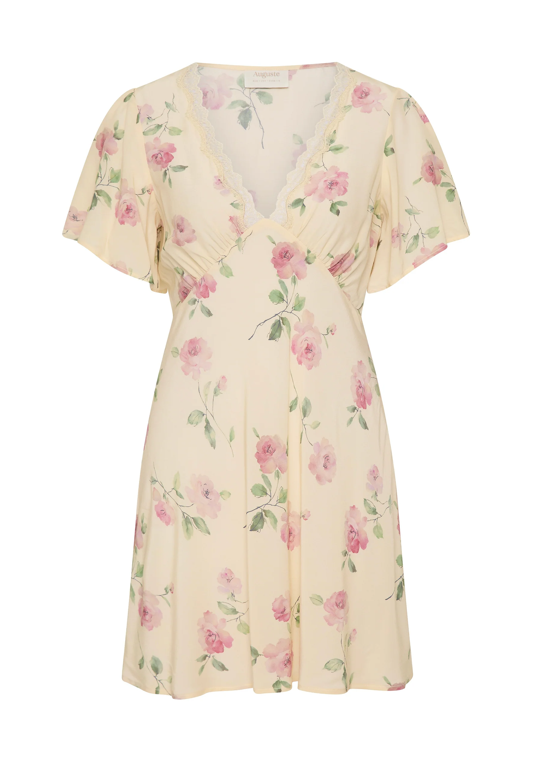 The Sadie Mini Dress in the Nova floral is a fresh silhouette made for sunlit summer days. With its lace-trimmed V neckline, under-bust gathers, and flutter sleeves, this feminine mini skims the body in a bias-cut shape that’s playful and flattering. Romantic and timeless, it’s the perfect mini for every occasion.Â