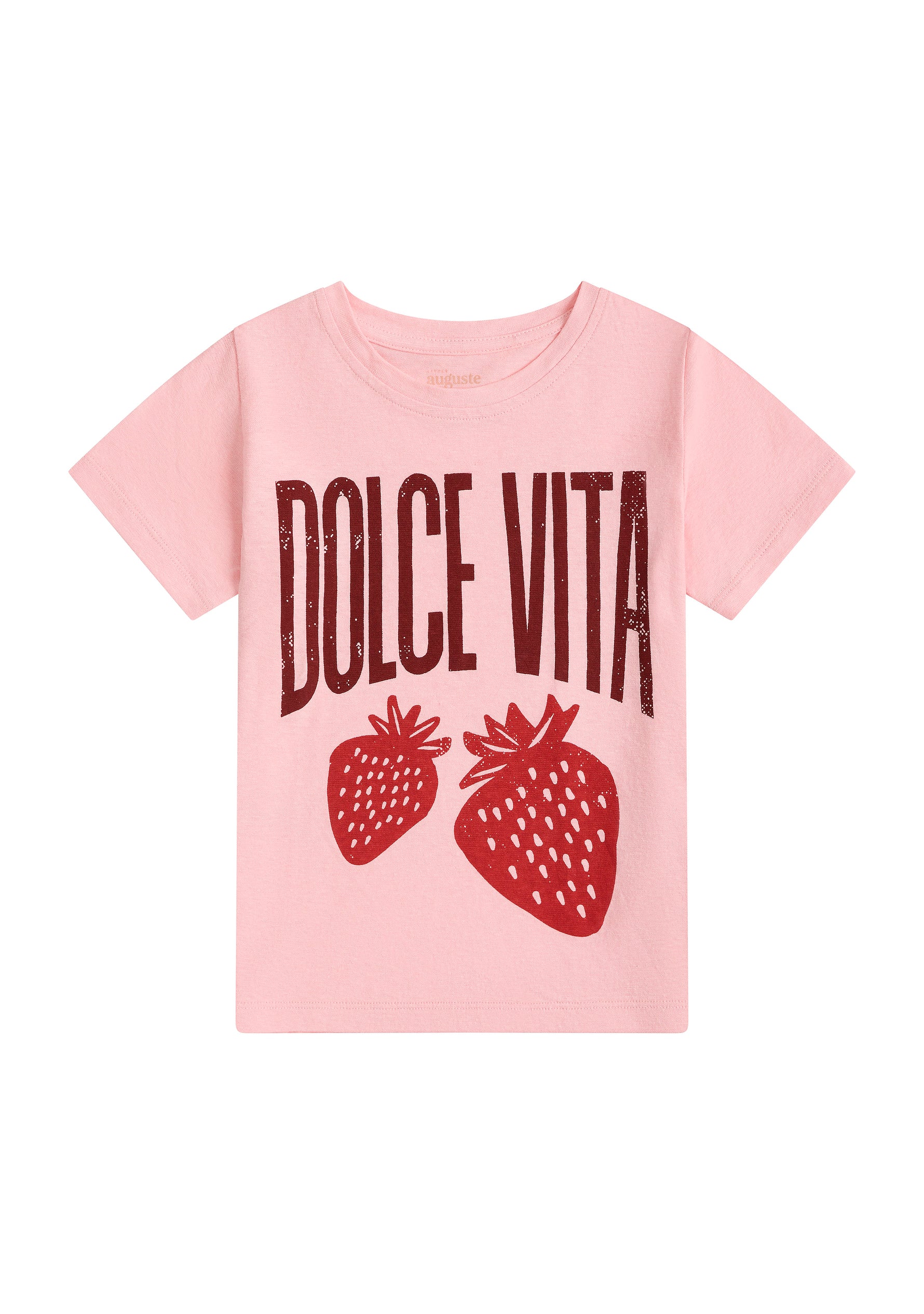 The Sweet Life Classic Tee in pink is crafted from a sustainable blend of hemp and cotton, featuring a crew neckline with a placement print on the front, designed by our talented team.
