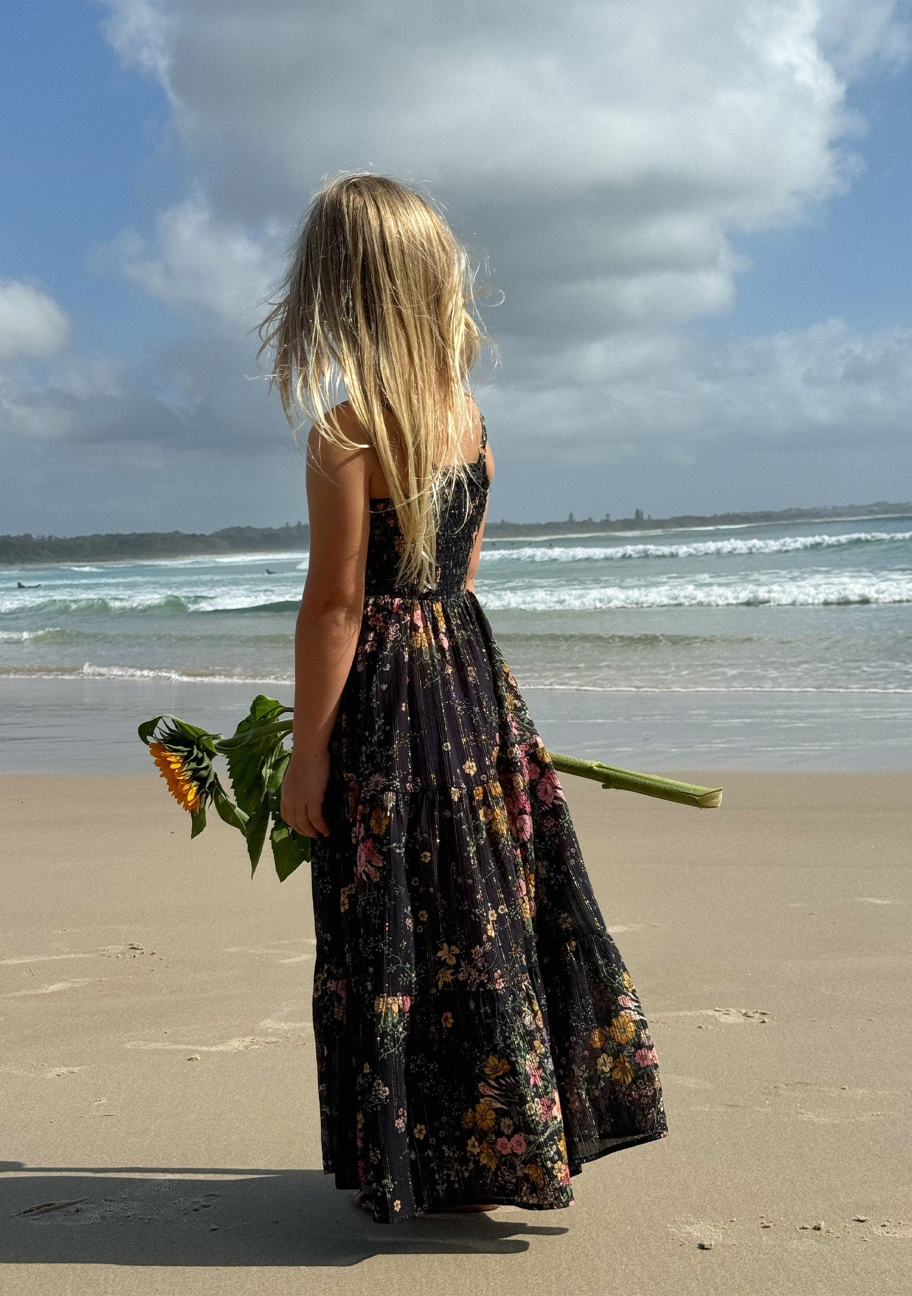 The best-selling Little Auguste Sweetheart Maxi Dress in our black Whisper Floral print, crafted from 100% cotton with gold lurex thread throughout, features a shirred bodice for growth, adjustable straps, and a full-volume tiered skirt perfect for twirling! Available in matching mummy-and-me styles, it’s destined to be her favorite dress. This Little Auguste bestseller is available exclusively online and in-store.